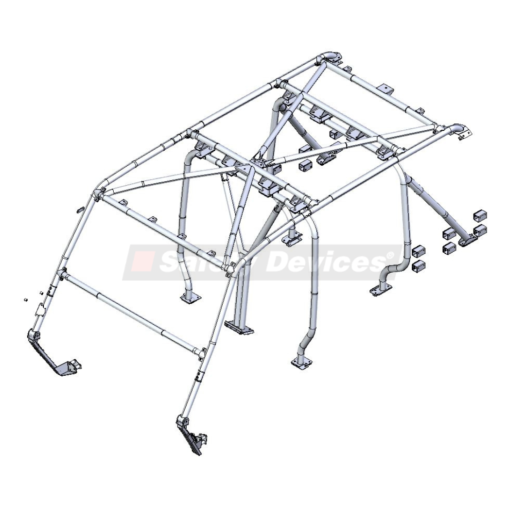 19 point multi-point external/internal bolt-in ROPS. Clears normal trim and dashboard, includes brackets for spot lights and beacons. Offers protection for all passengers and includes Safety Devices trademark flexible linkage system to minimise vehicle body fatigue. Incorporates new ‘Y’ bracing to maximise central passenger leg room. For standard vehicles without a sunroof, air intake snorkel, GPS antenna/dome or curtain airbags.