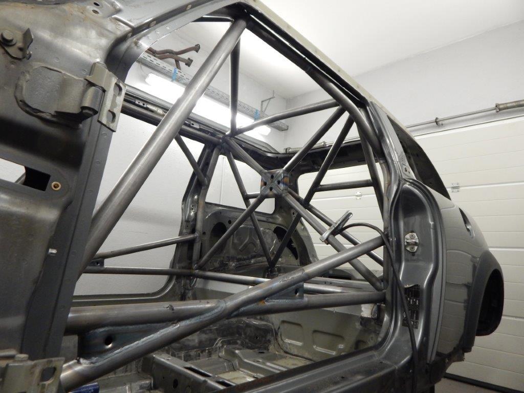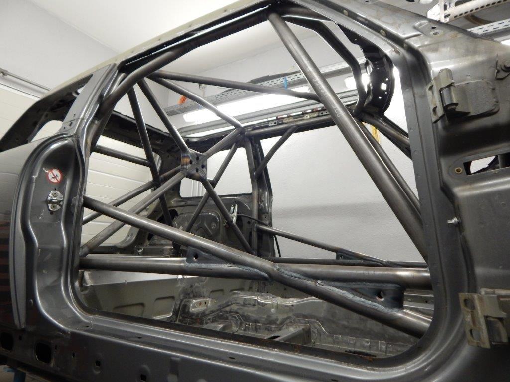 CDS full weld-in cage with cross door bars, cross diagonal in backstays, single roof diagonal, cross in main hoop, tunnel brace, pit prop, front triangulation, harness bars.