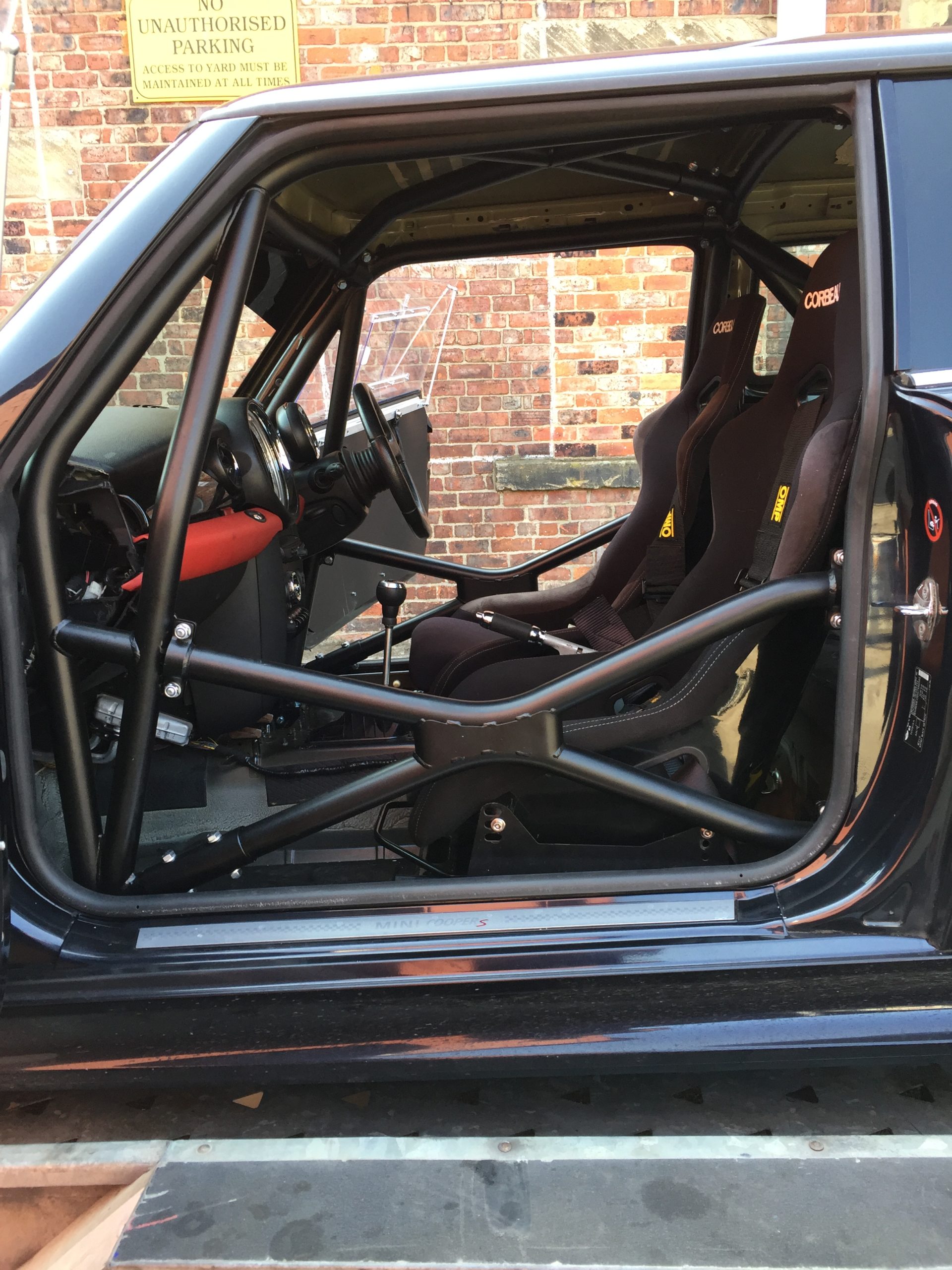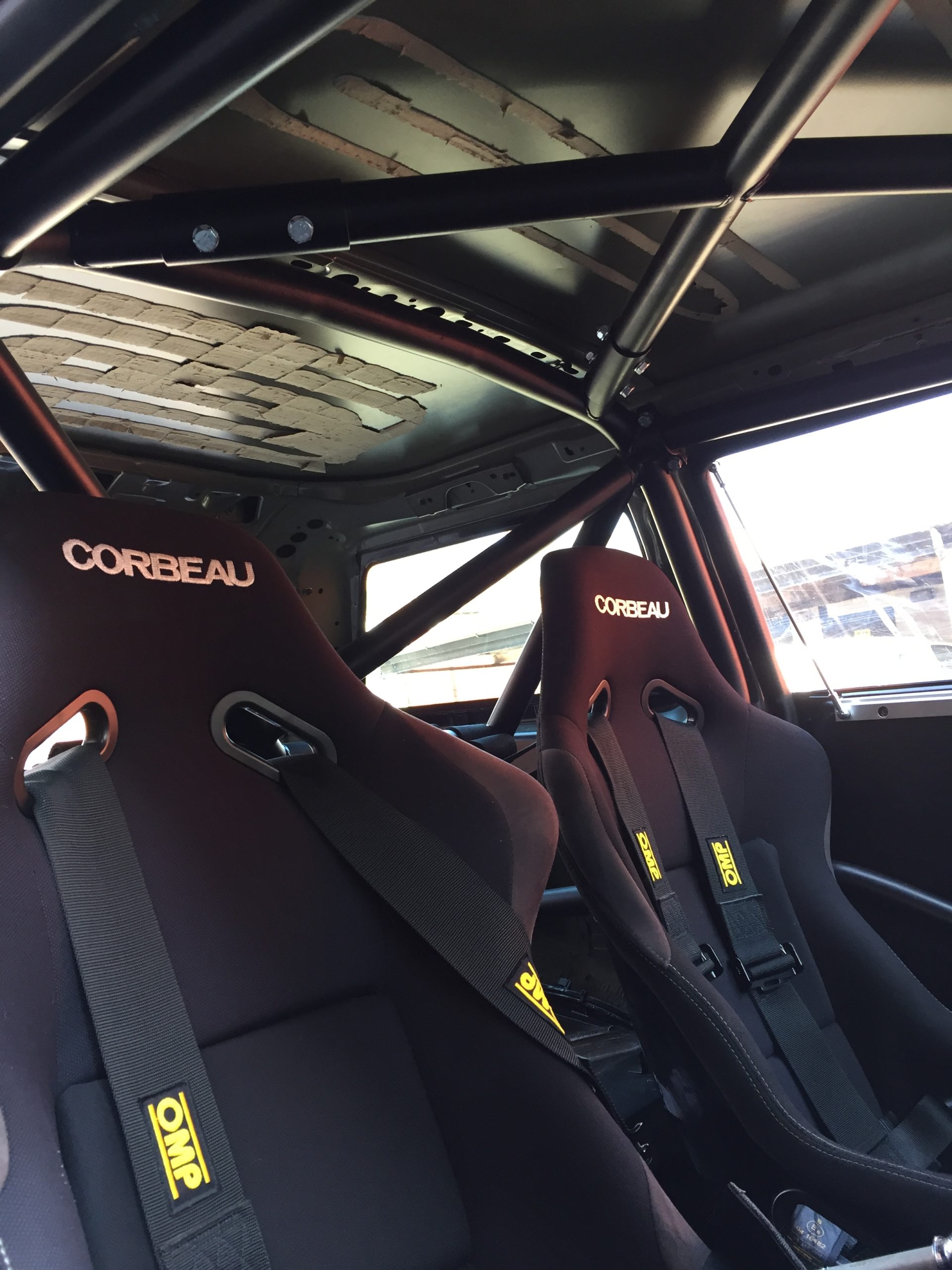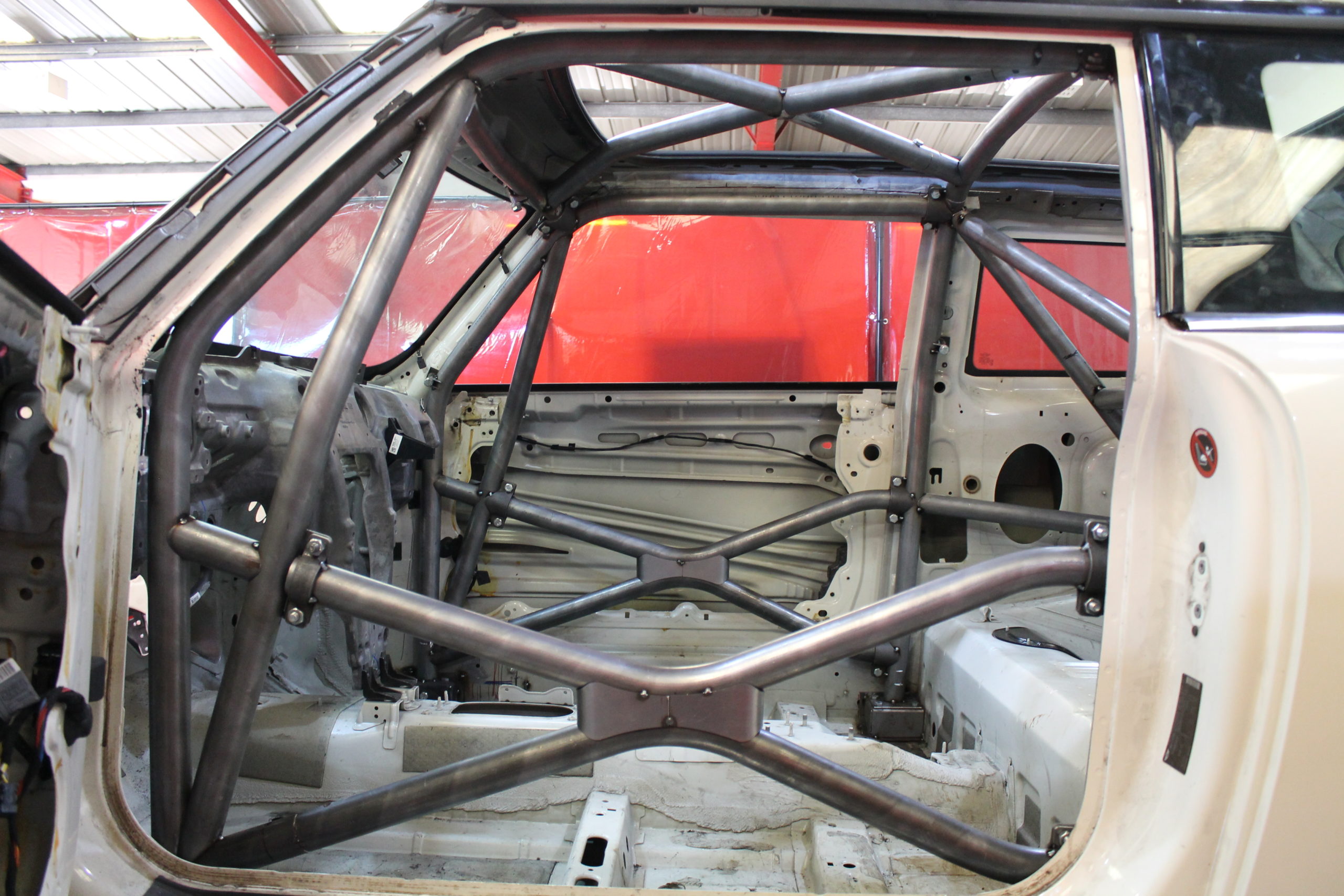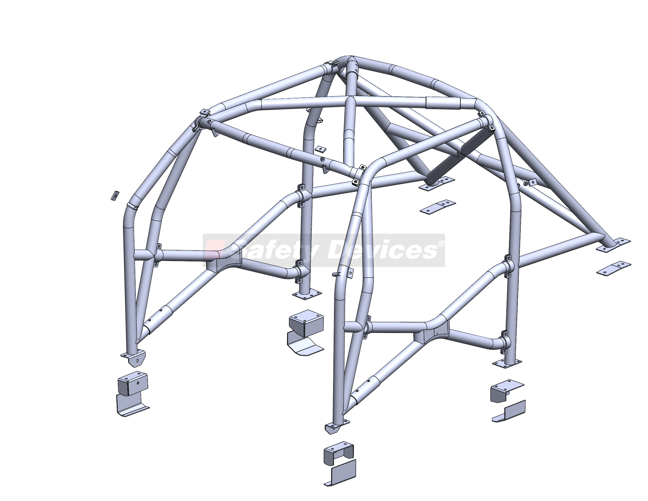 Multipoint bolt in roll cage. For vehicles without interior trim. Front cage penetrates dashboard.