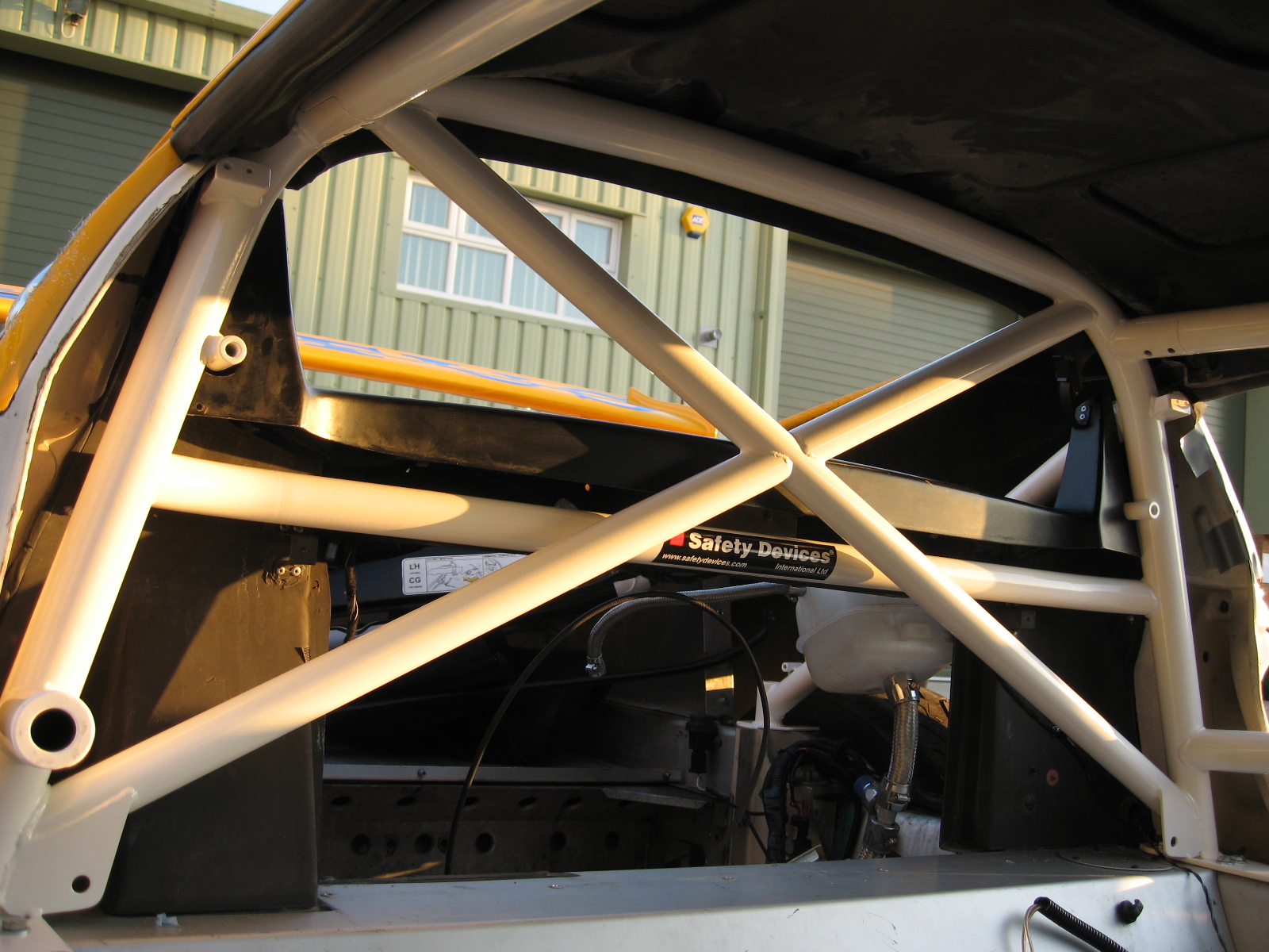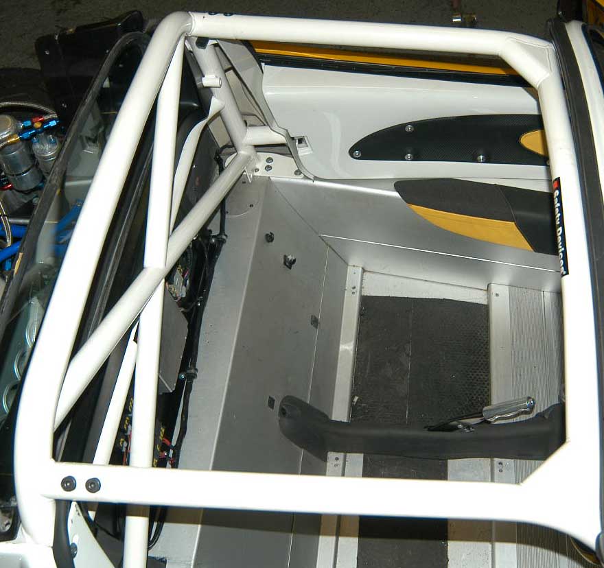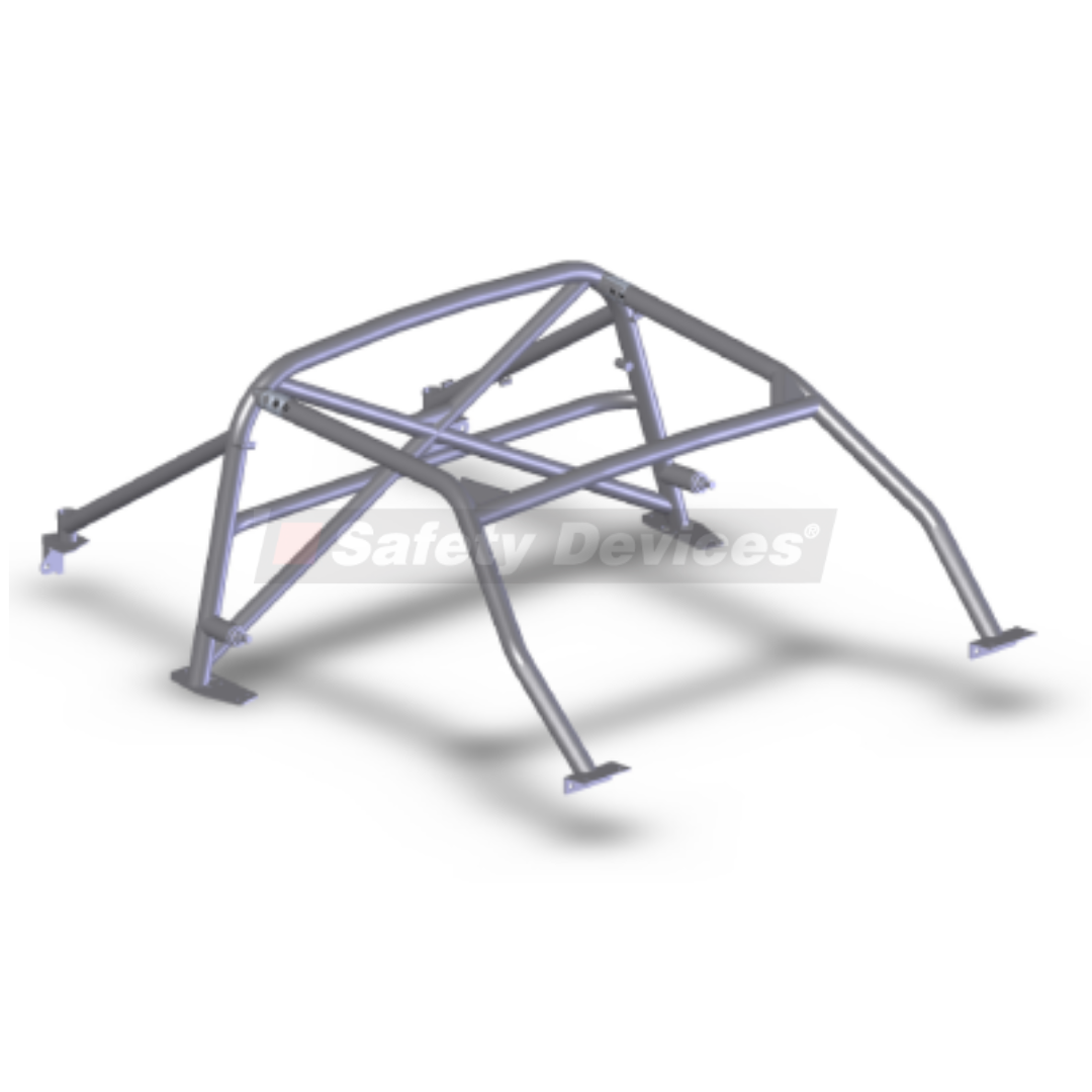 6 point bolt-in cage. Rear cage replaces original roll hoop. Rear cage has cross diagonal and harness bar. Existing seat belt arrangement can be retained. Front cage mounts through dash. Trim and body work modifications required.