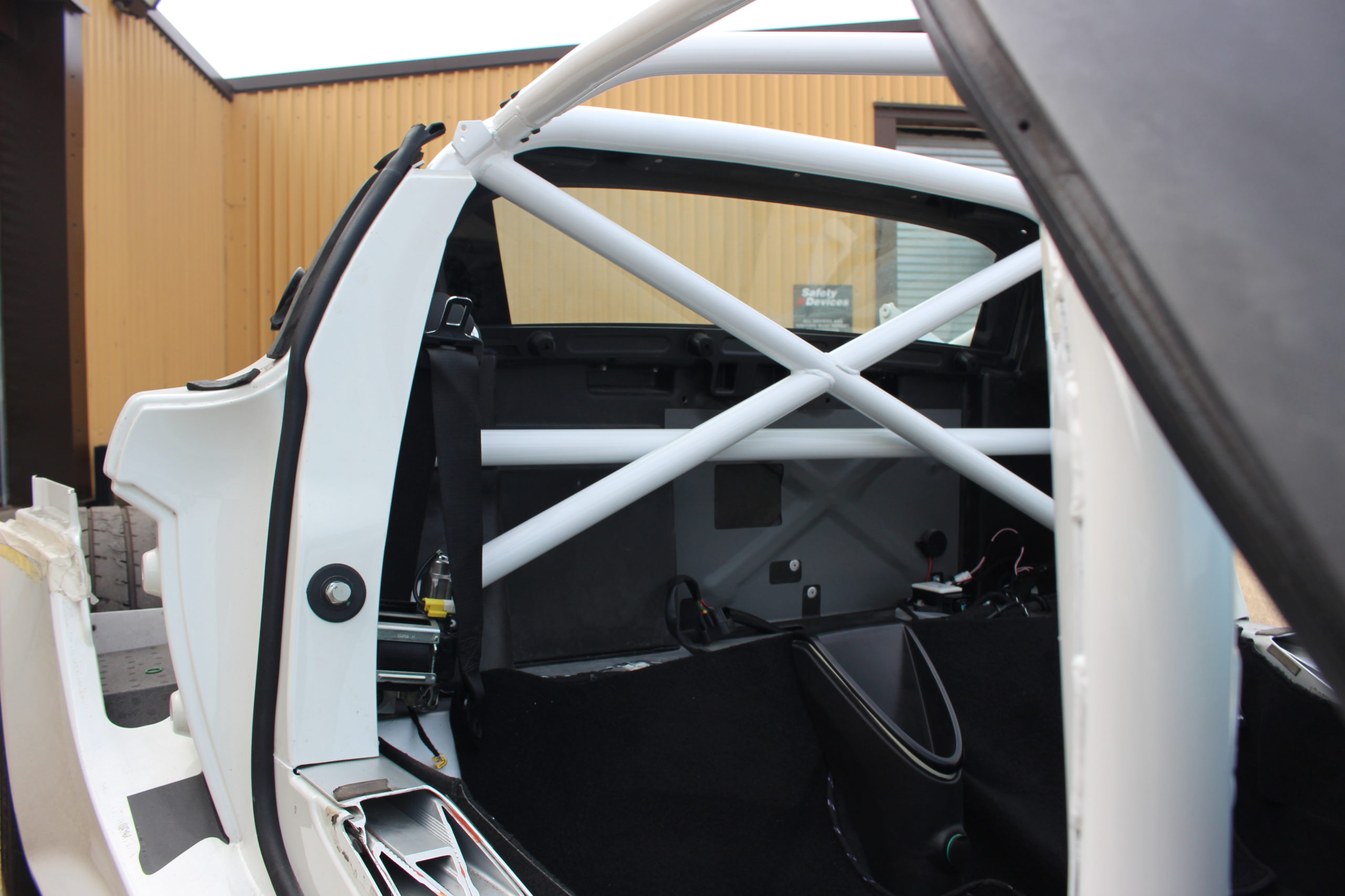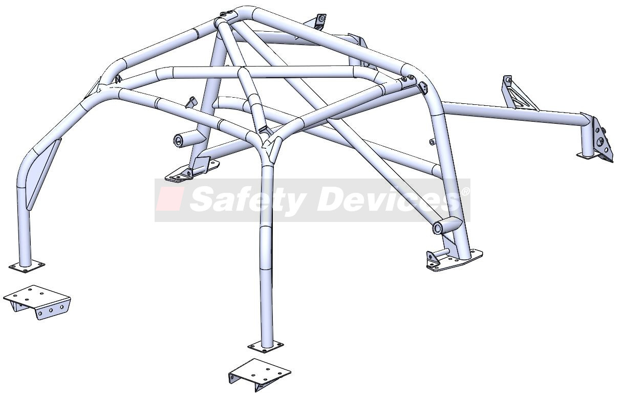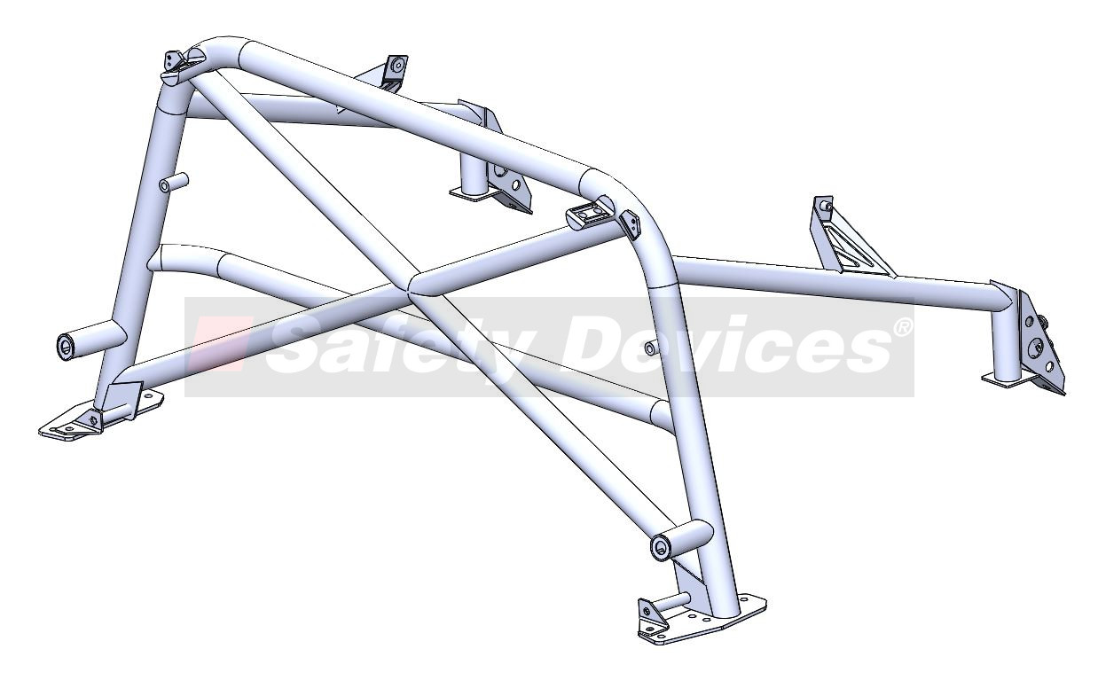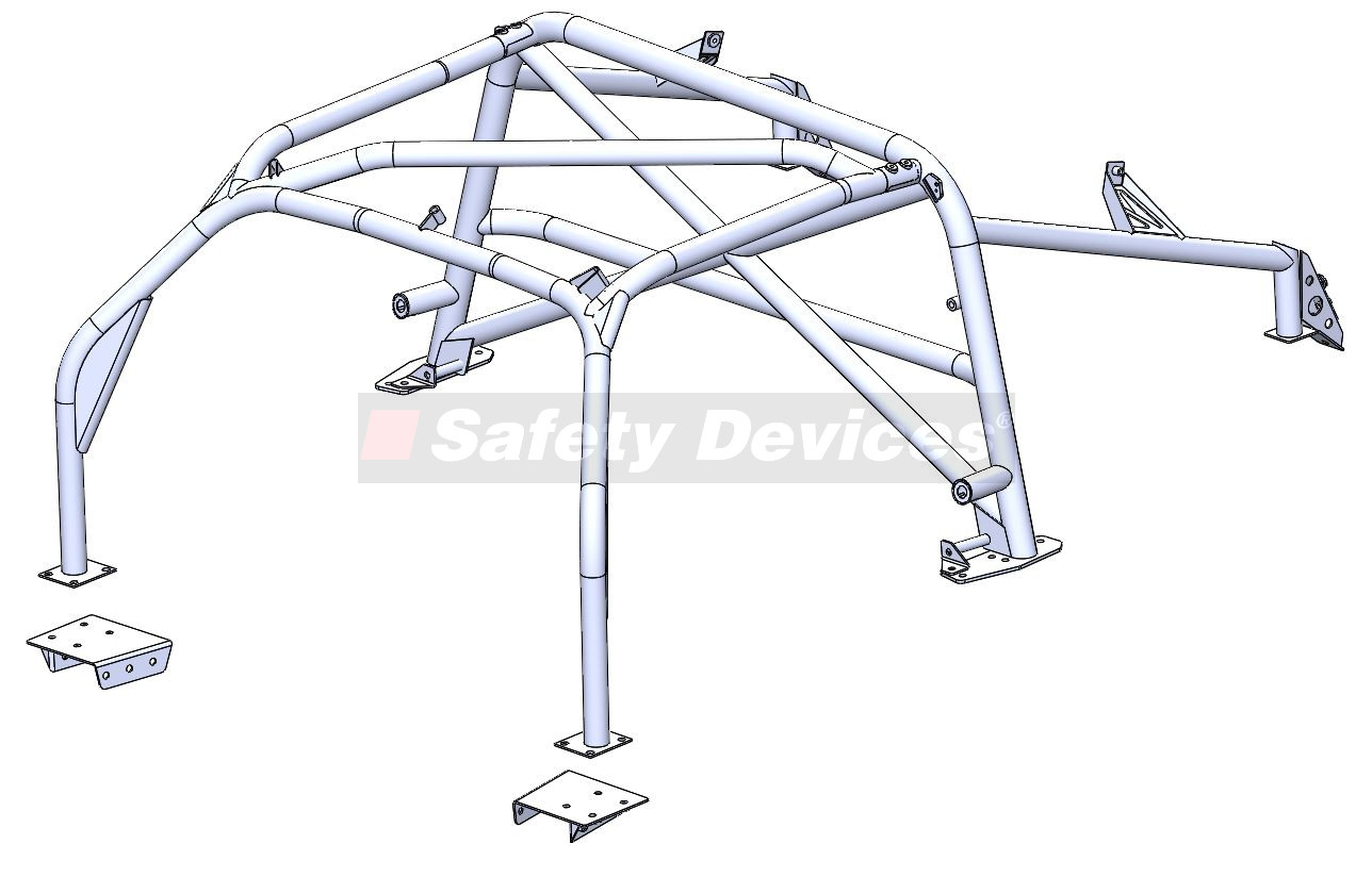 6 point bolt-in cage. Front cage mounts to sills. Front cage has single roof diagonal or roof cross. Trim and body work modifications required. Not a DIY fit. Rear cage replaces original roll hoop. Rear cage has cross diagonal and harness bar. Existing seat belt arrangement can be retained.