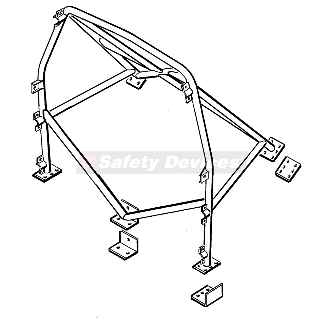 Bolt-in cage to clear dashboard. Mounts in 14 places to floor, rear wheel arches, ‘B’ post belt mount point, ‘A’ post, above front screen and above doors. Lower back stays and tunnel brace as standard.