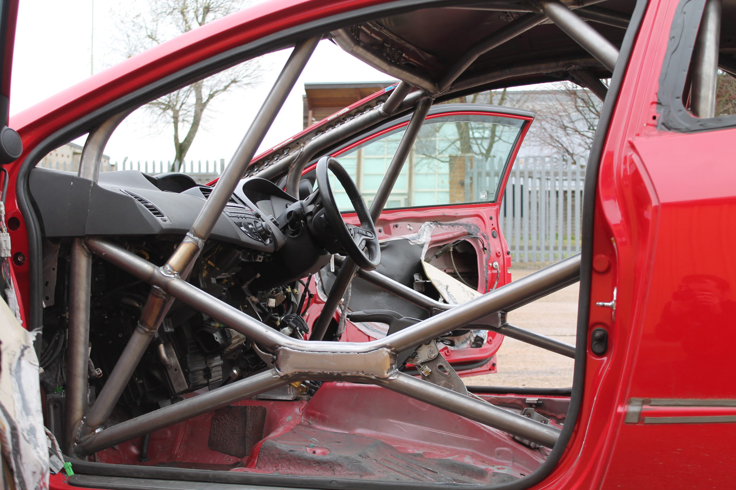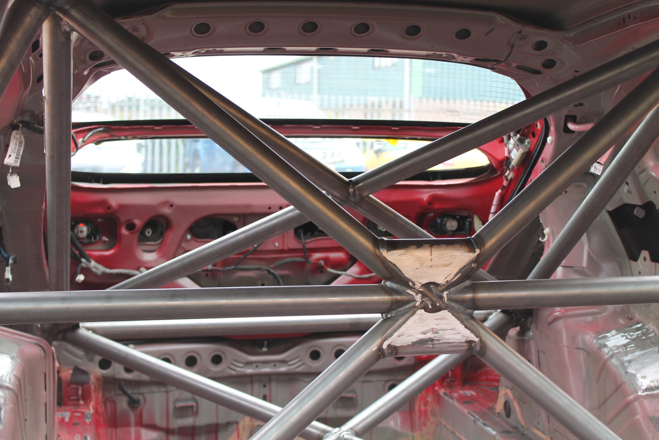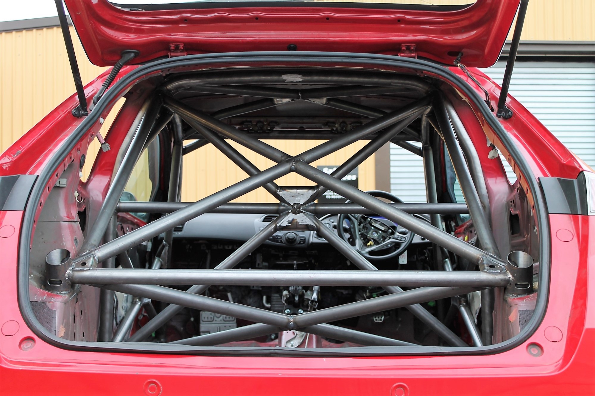 CDS weld-in cage with bent cross door bars, cross diagonal and harness bars in main hoop, cross diagonal in backstays, lower cross from main hoop to backstays, front triangulation, windscreen reinforcement bars, roof cross, rear strut brace. Optional front strut brace.