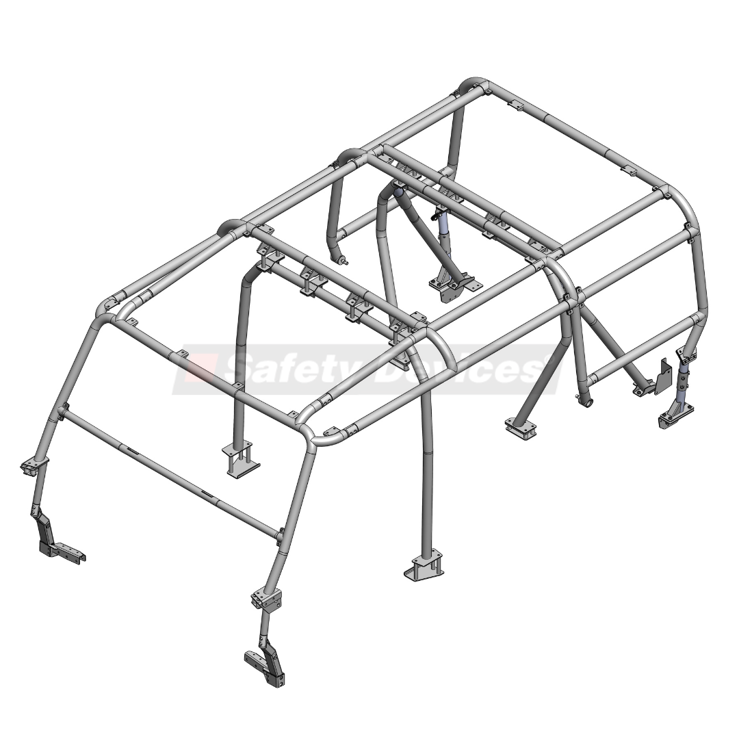 Full Internal/External Roll Cage, mounted to the chassis at 4 locations and to the body at 4 locations. Internal B Hoop (without Y bracing), C Hoop and Backstays. Requires interior trim to be modified to allow installation. Compatible for vehicles with Safari windows.