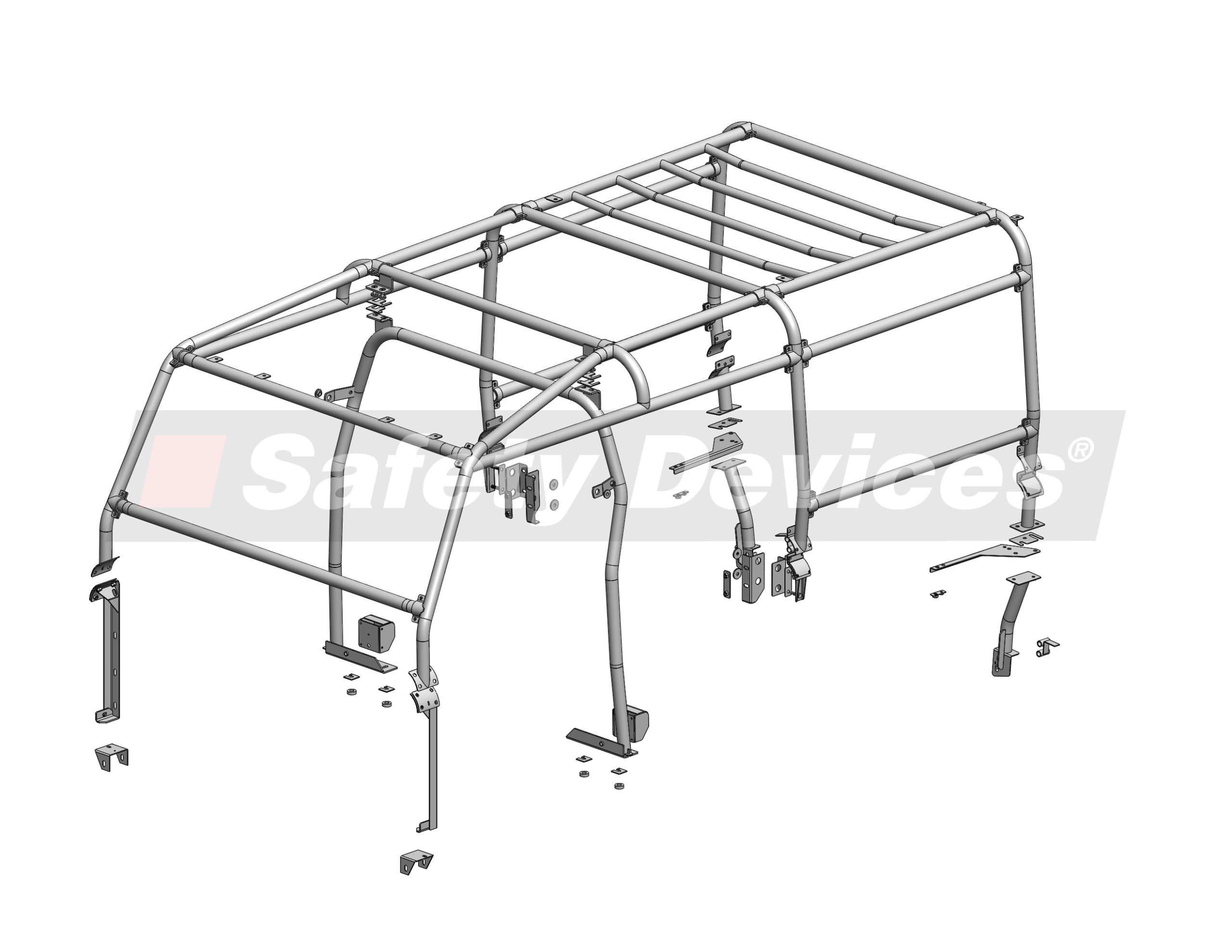 Please note that models between 1983 – 1988 had three raised ribs on the roof approx. 22mm (7/8″) tall. This kind of roof does not work with our external roll cages as the hoops will clash with them. Nor will it fit if the rear seat box is stepped in the rear corner. Compatible with Safety Devices ‘Explorer’ Roof Racks for roll cage mount. Compatible with Safety Devices L052 ladder. Available as a full cage only.