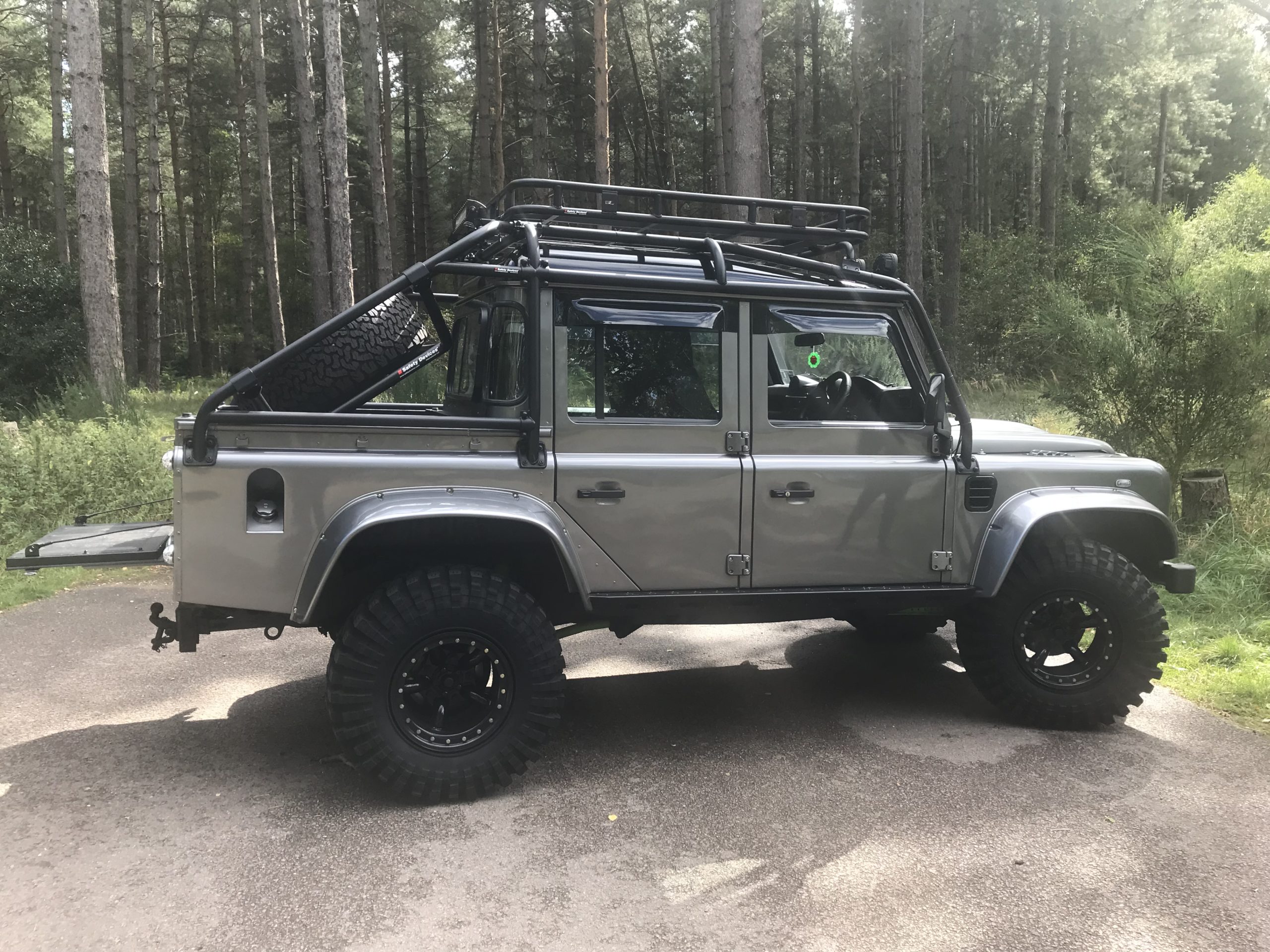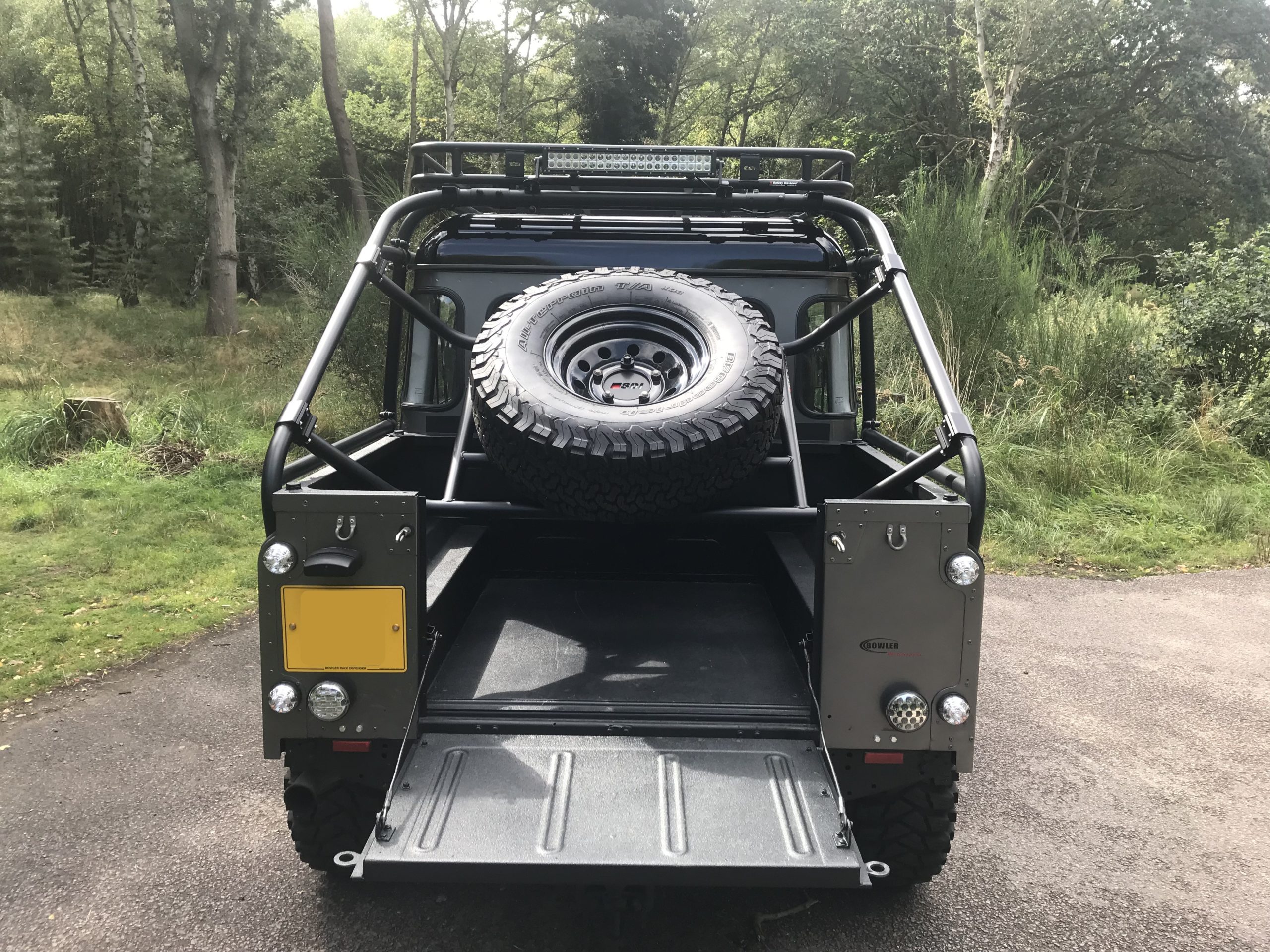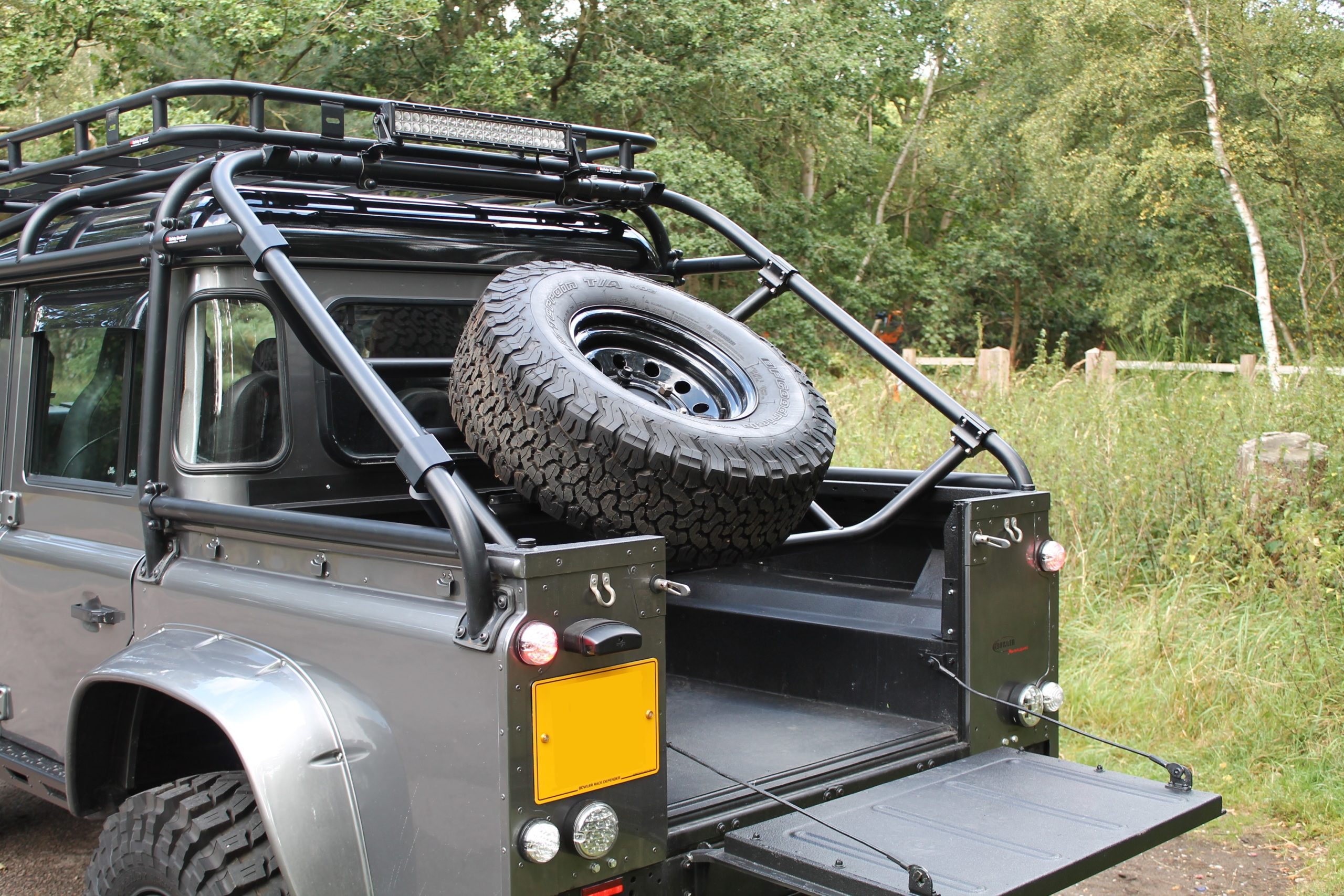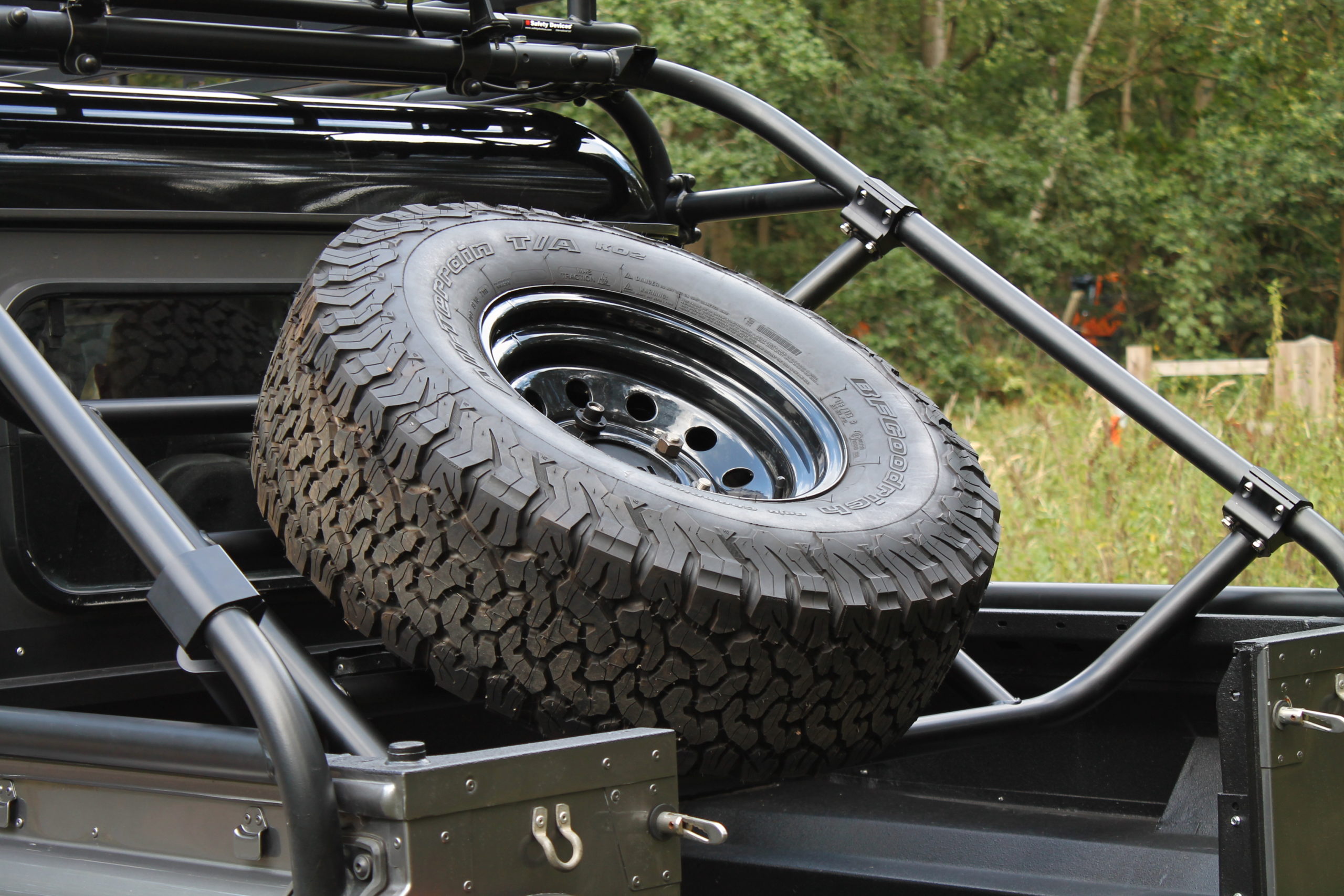 Defender DCPU Fixed Spare Wheel Carrier. Rear load bed spare wheel carrier, capable of supporting a 35” tyre. Also features an adjustable length wheel centre to suit different tyres and wheel offsets. Mounts to roll cage with aluminium clamps (included).