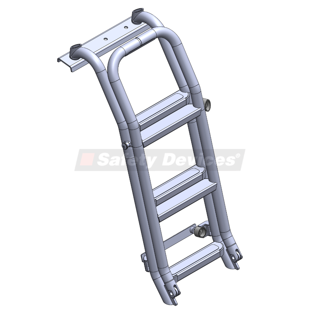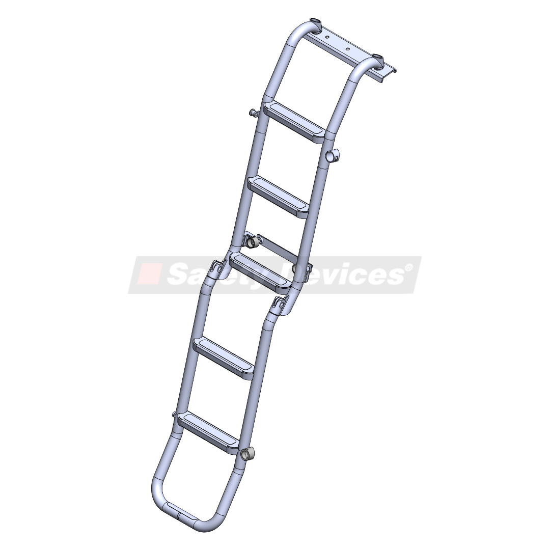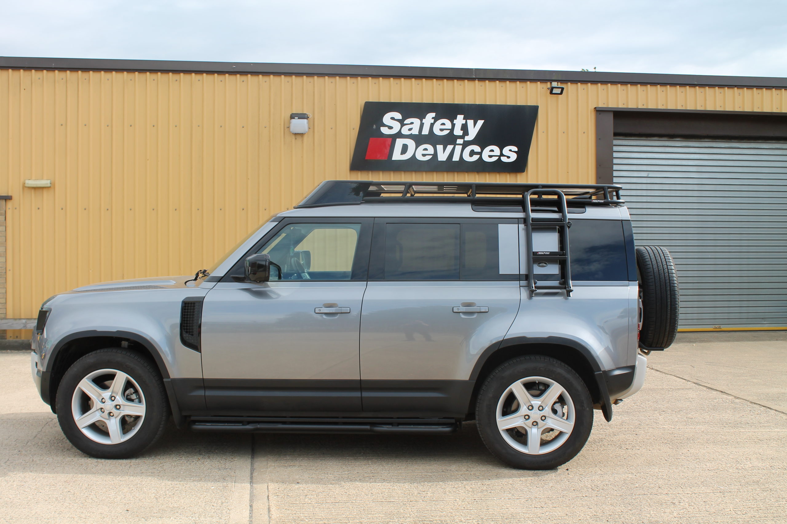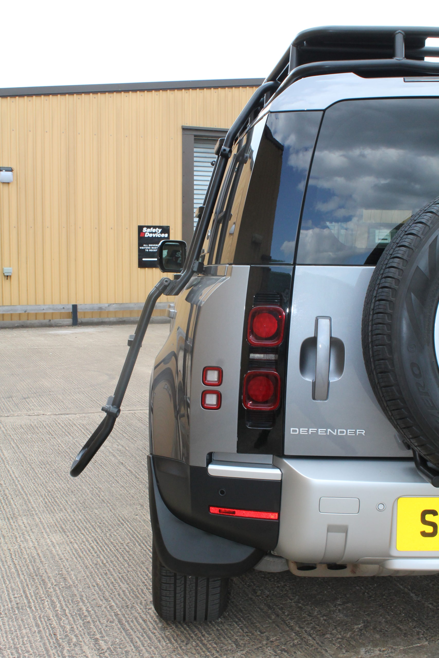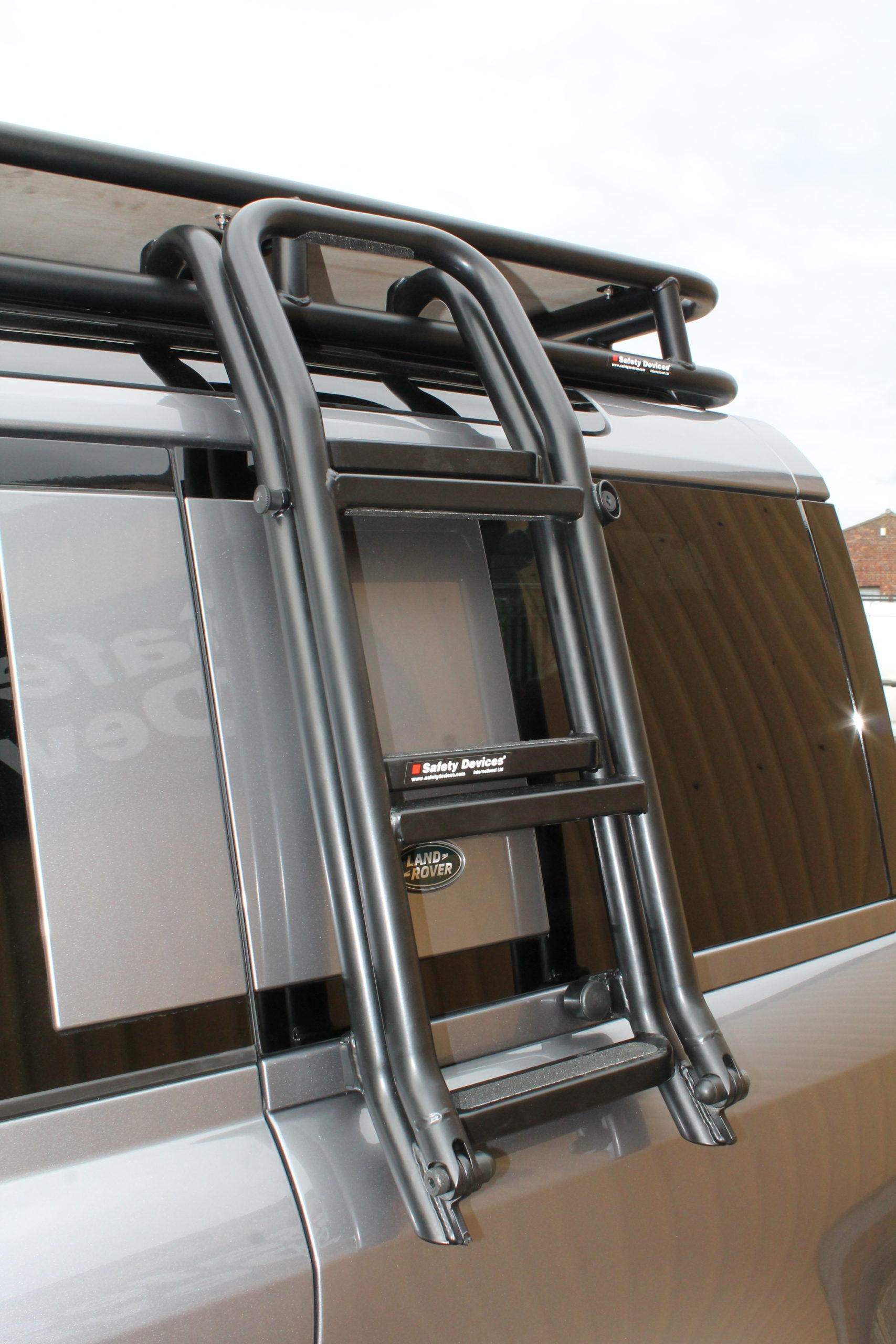 Roof access ladder that can be fitted to either side of the vehicle. It can be installed standalone or in conjunction with our Roof Rack Assembly (L300). Made of a folding construction with dual securing methods and a key locking mechanism. Requires drilling of the trim panels below the rear window to allow installation into the existing LR body mounts beneath. When deployed, the height from the floor to the lowest step of the ladder is 585mm at normal ride height (660mm at max and 550mm at min).