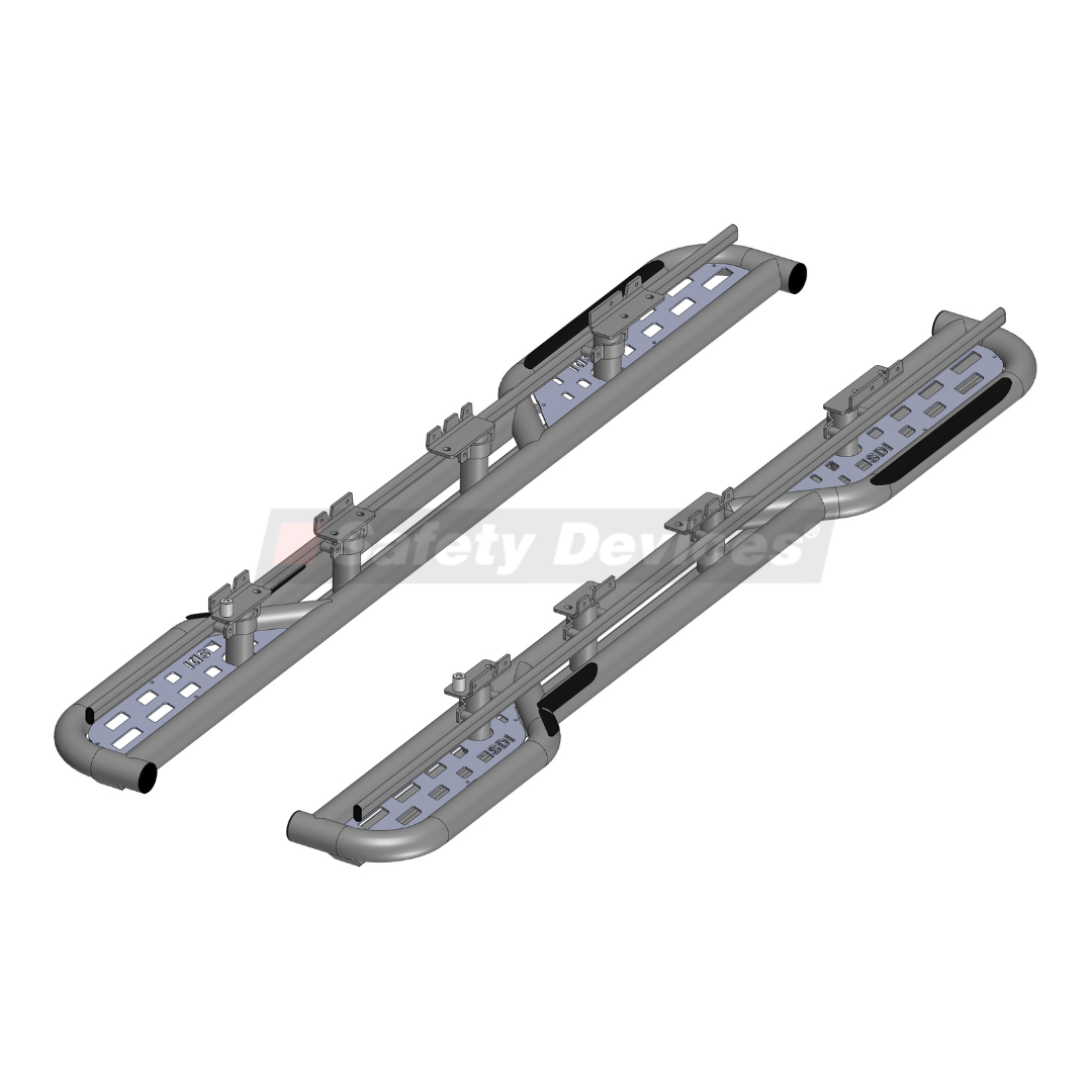 Side steps and toe rail kit with non-slip tape and stainless-steel infill plates. Designed to mount on existing mounts within the sill. The plastic sill covers will require slight modification to allow access to the mounting points. Supplied with an adapter to allow the OEM jack to be used.