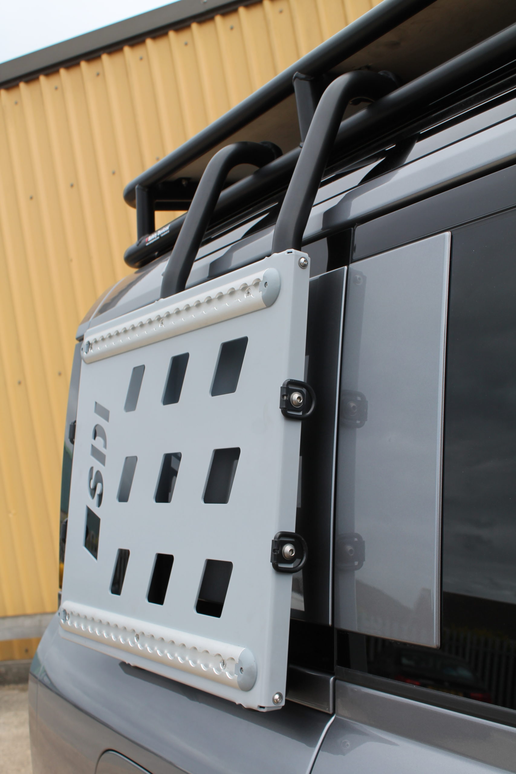 Multi-purpose accessory mount that can be fitted to either side of the vehicle. It can be installed standalone or in conjunction with our Roof Rack Assembly (L300). Features mounting rails along upper and lower sides along with 4 x tie down points. Requires drilling of the trim panels below the rear window to allow installation into the existing LR body mounts beneath.