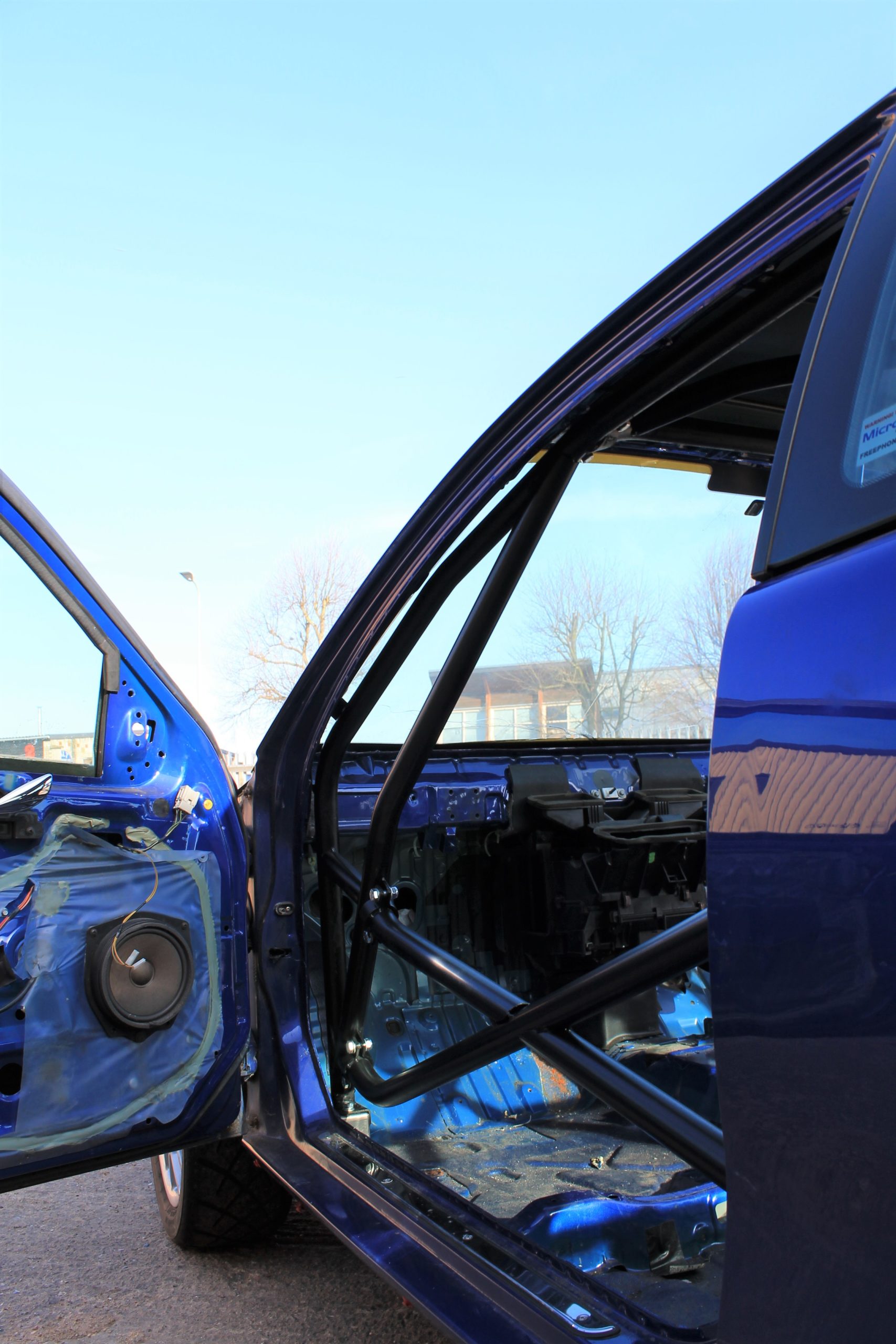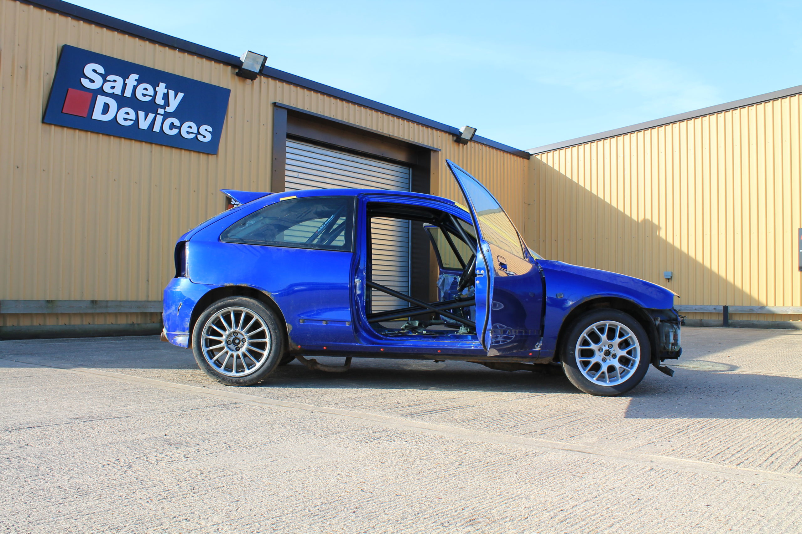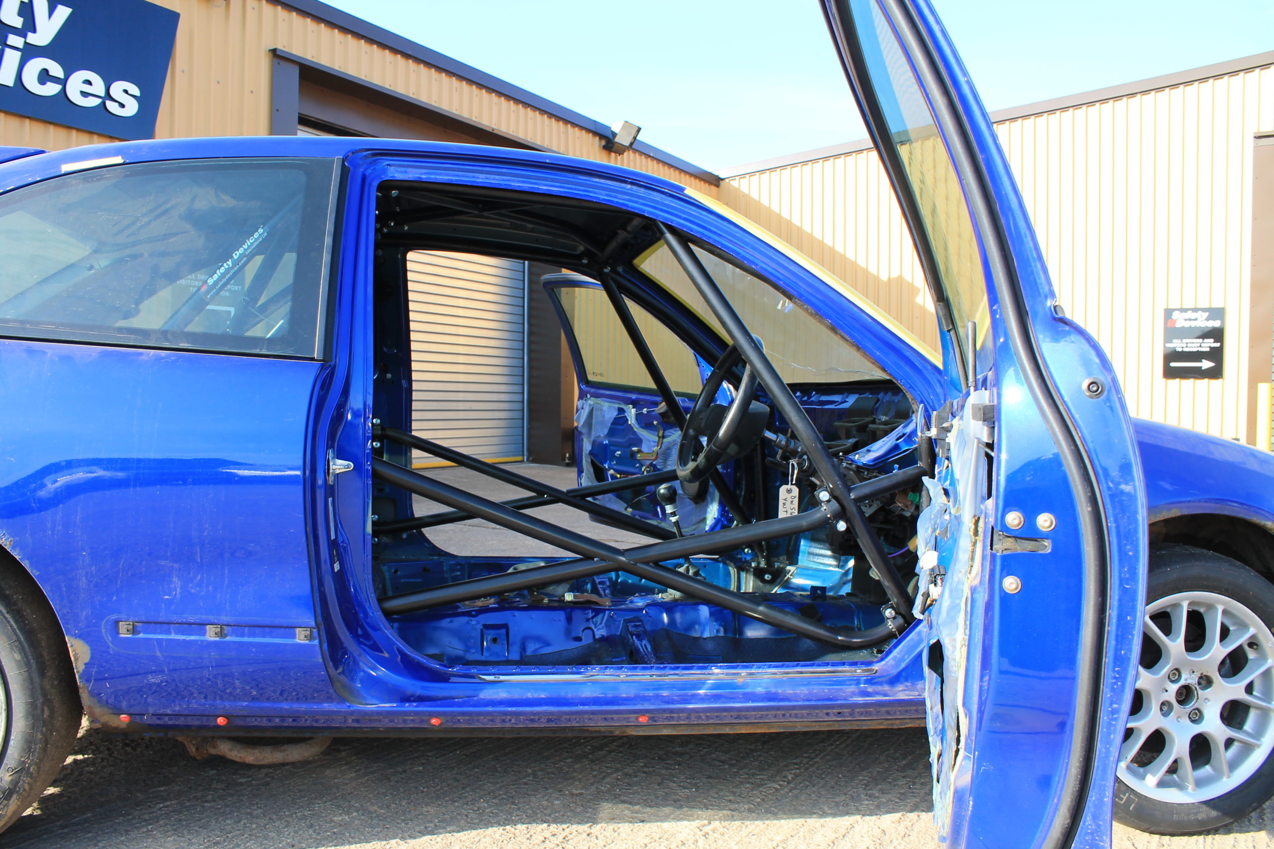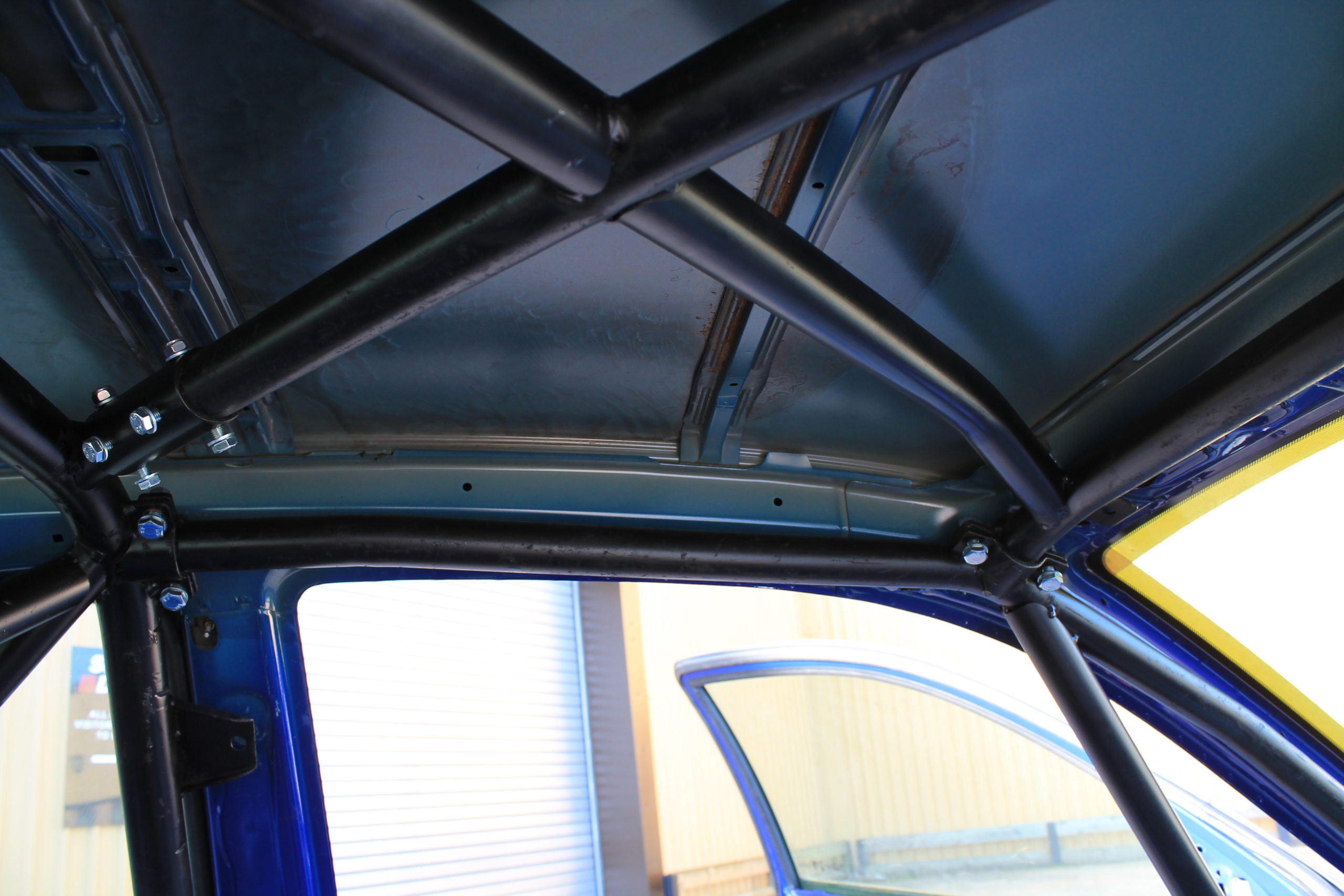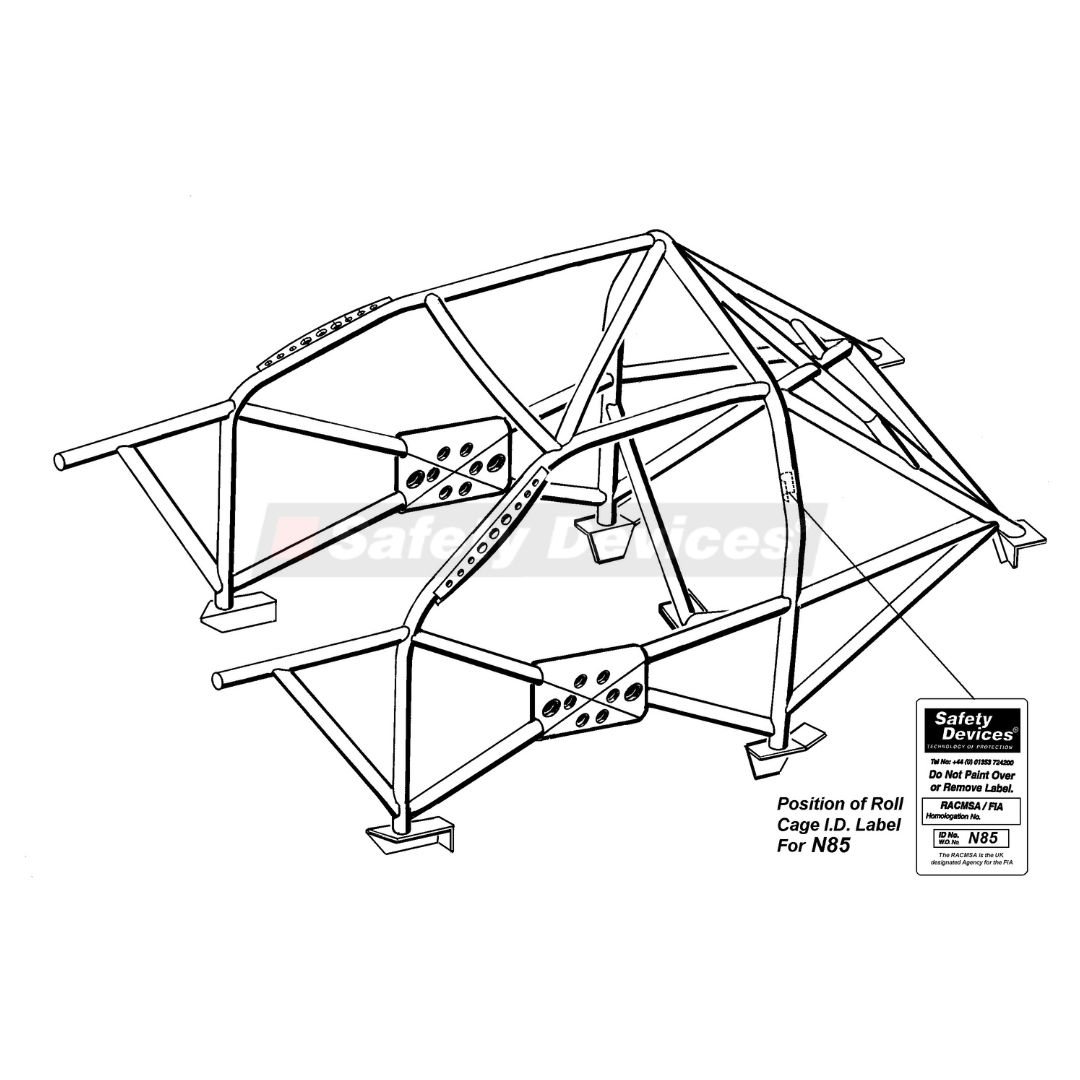 Multi-point cage for MG championship. Features windscreen reinforcement pillars, cross door bars, roof bracing, cross diagonal and harness bar, lower backstays and tunnel brace.