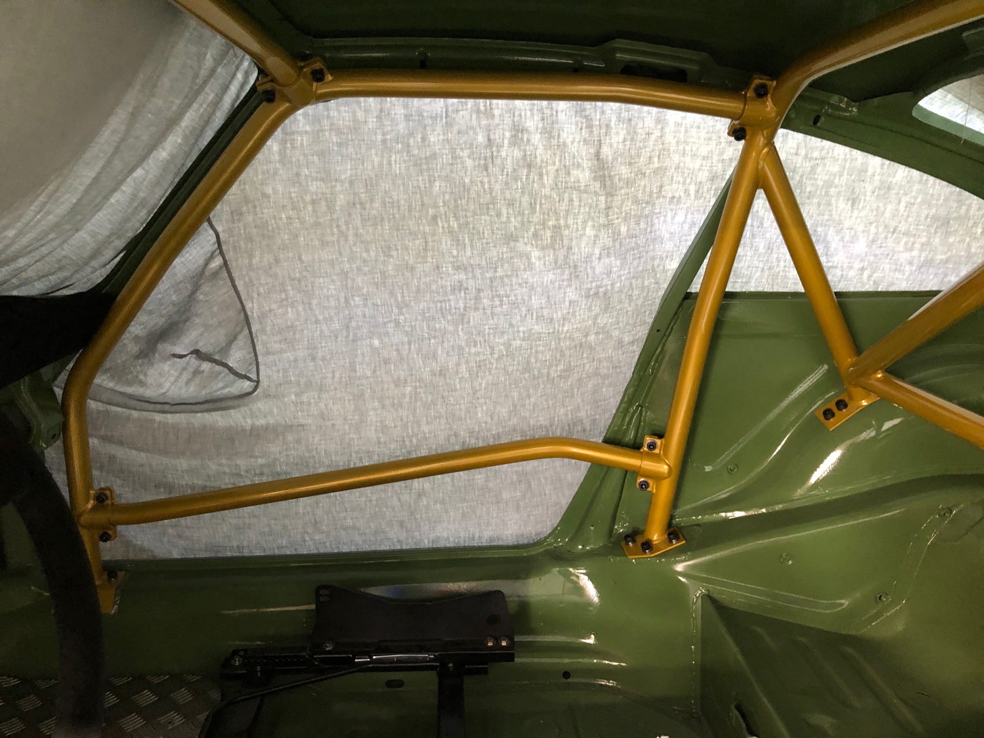 6 point bolt-in to clear normal trim and dashboard. Front cage mounts to sills and rear cage mounts to sills and rear wheel arches. Single unique door bars.