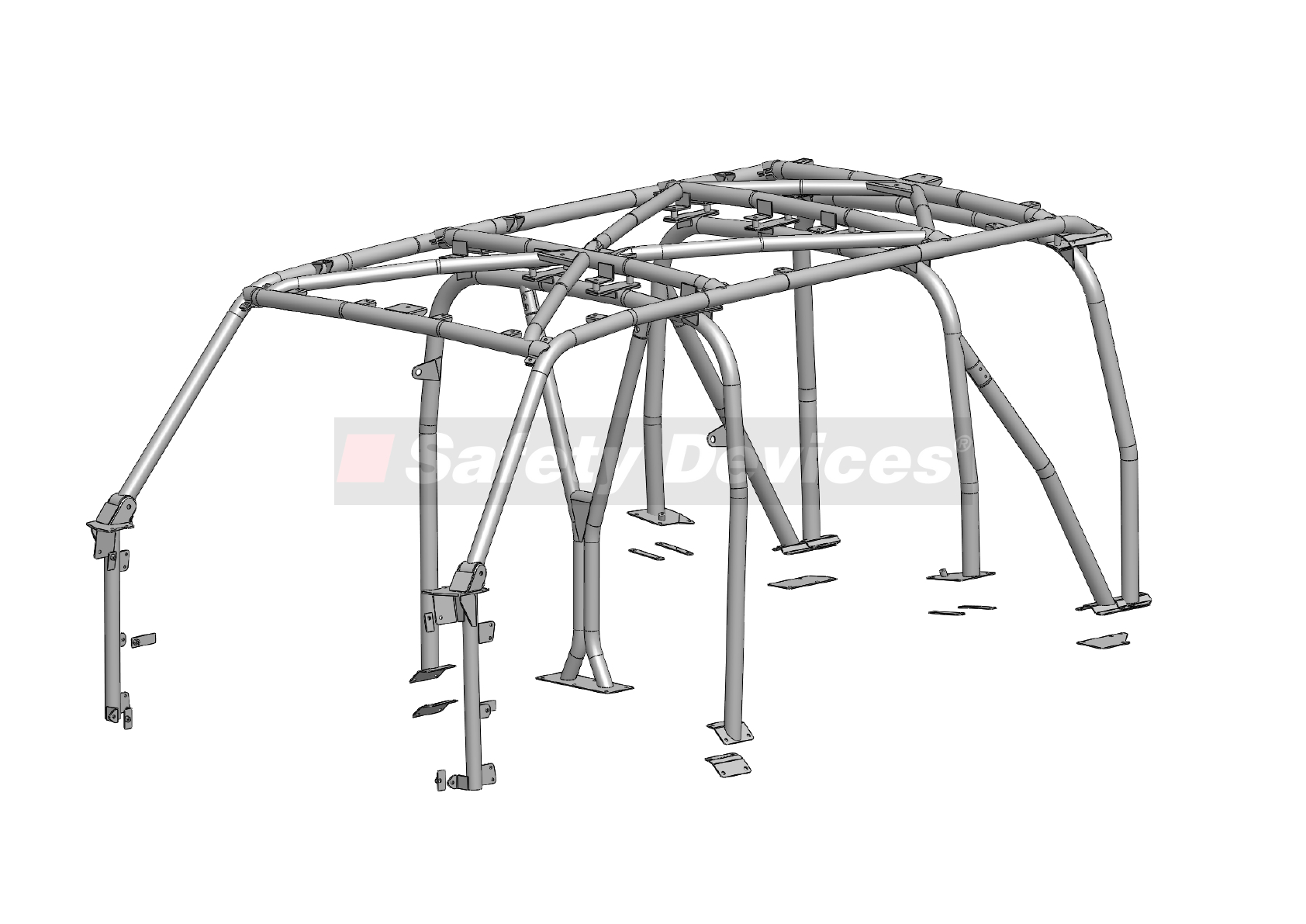 19 point multi-point external/internal bolt-in ROPS. Clears normal trim and dashboard, includes bespoke mountings for OEM roof rack and additional brackets for spot lights and beacons. Offers protection for all passengers and includes Safety Devices trademark flexible linkage system to minimise vehicle body fatigue. Incorporates new ‘Y’ bracing to maximise central passenger leg room. For standard vehicles without a sunroof, air intake snorkel, GPS antenna/dome or curtain airbags.