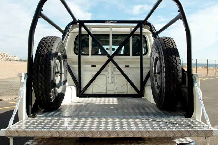 17 point multi-point bolt-in external and internal ROPS for industrial use based on T078. Clears standard trim and dashboard. Includes 2 additional seatbelt tags. Y bracing in B hoop. Allows use of existing spare wheel mounting on rear body and includes additional brackets for spot lights and beacons. Includes additional rear section mounting to the bed.