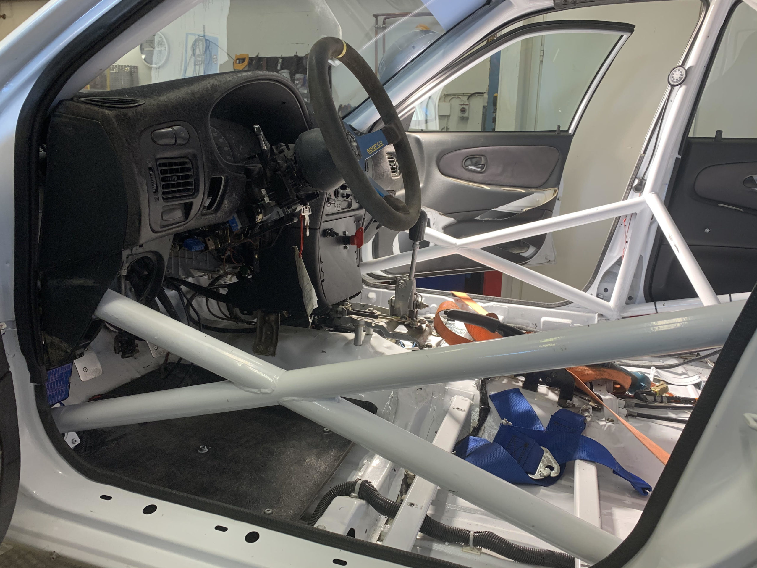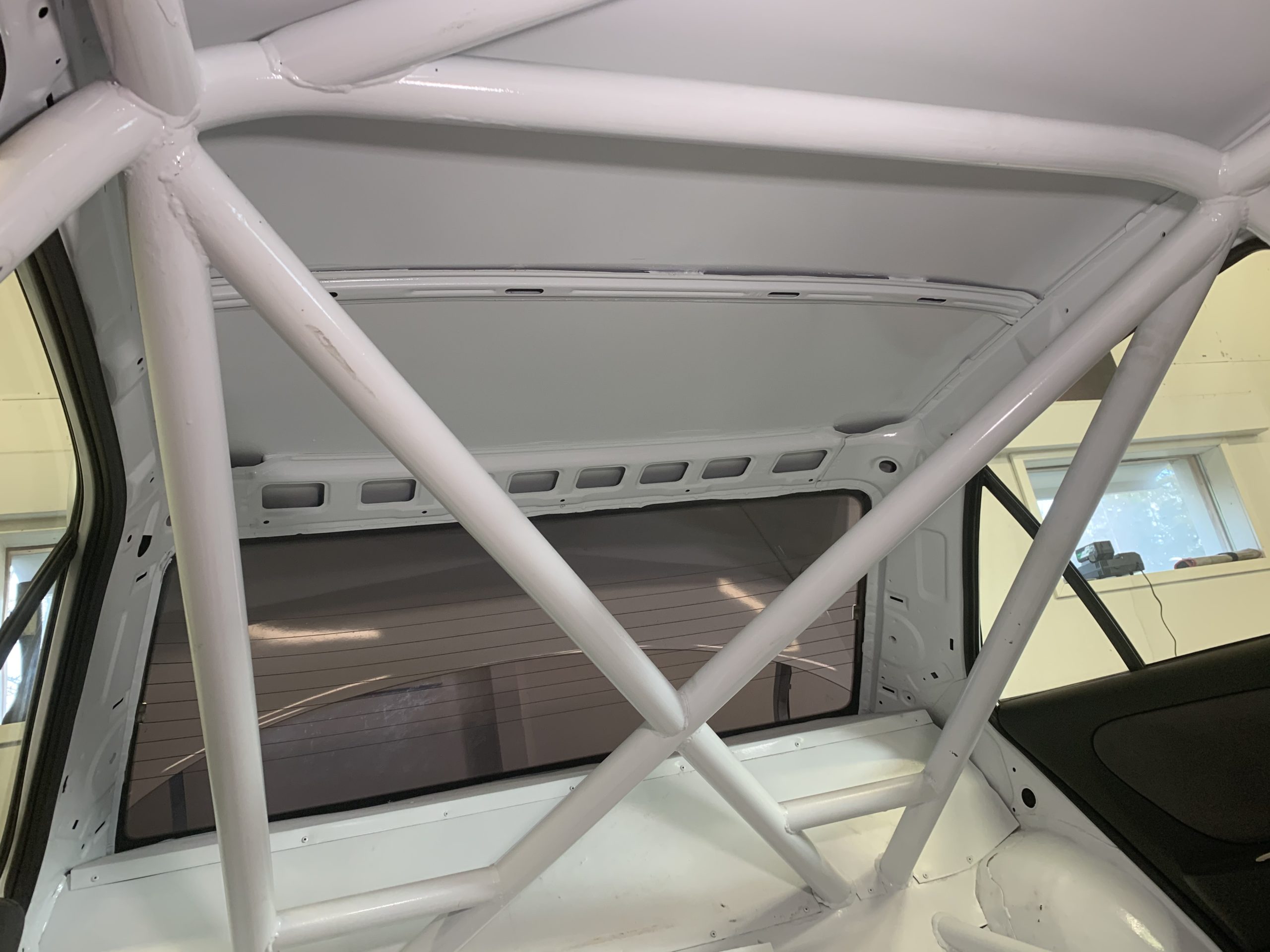 CDS full weld-in cage with cross door bars, cross diagonal in backstays, single roof diagonal, lower backstays, front triangulation, harness bars, rear strut brace, tunnel brace, rear floor bracing.
