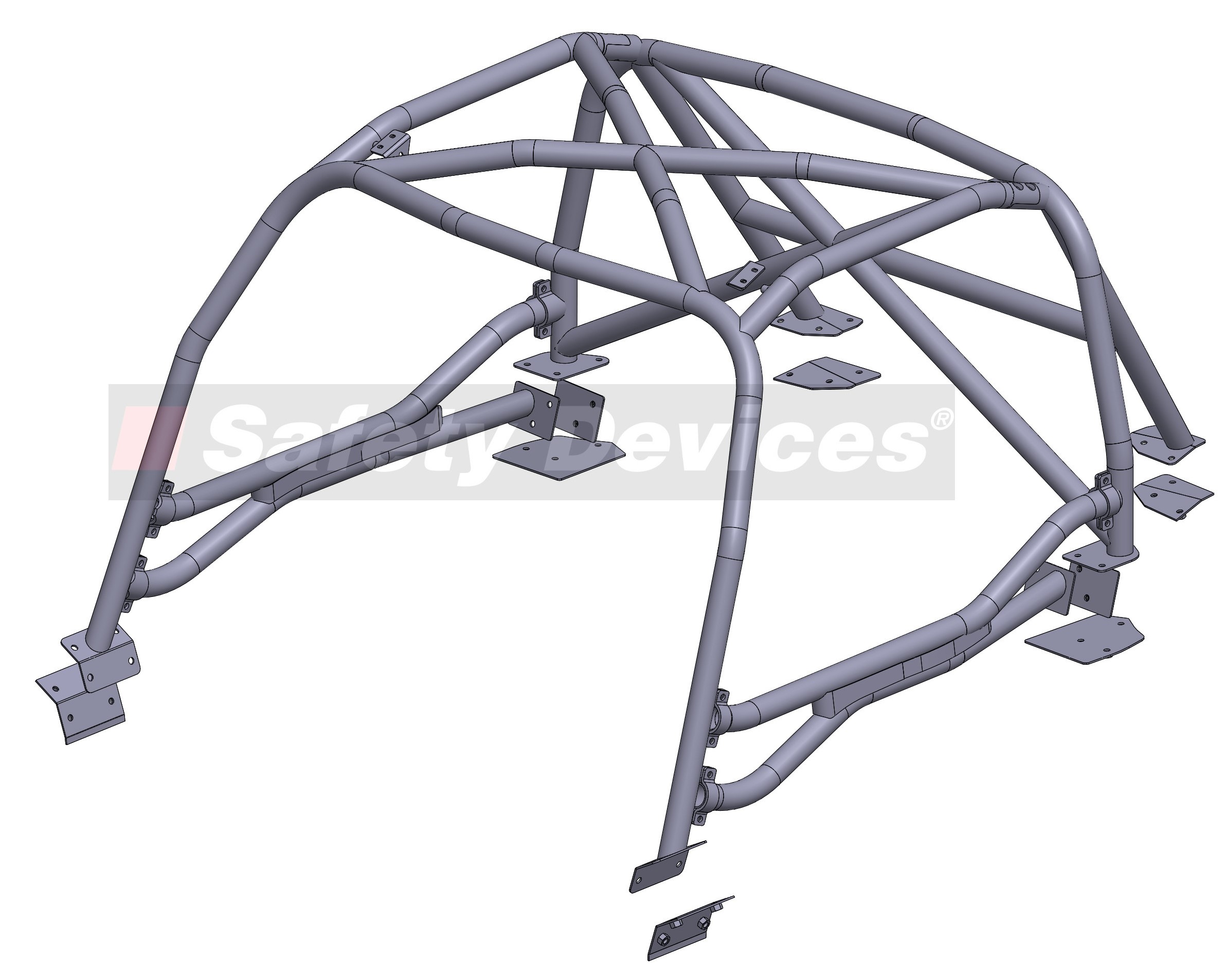 6 point bolt-in race cage (avoids dash), cross diagonal in main hoop, cross roof diagonal, harness bar, cross door bars. Will not fit with a metal folding roof. Will fit with an aftermarket fibreglass roof.